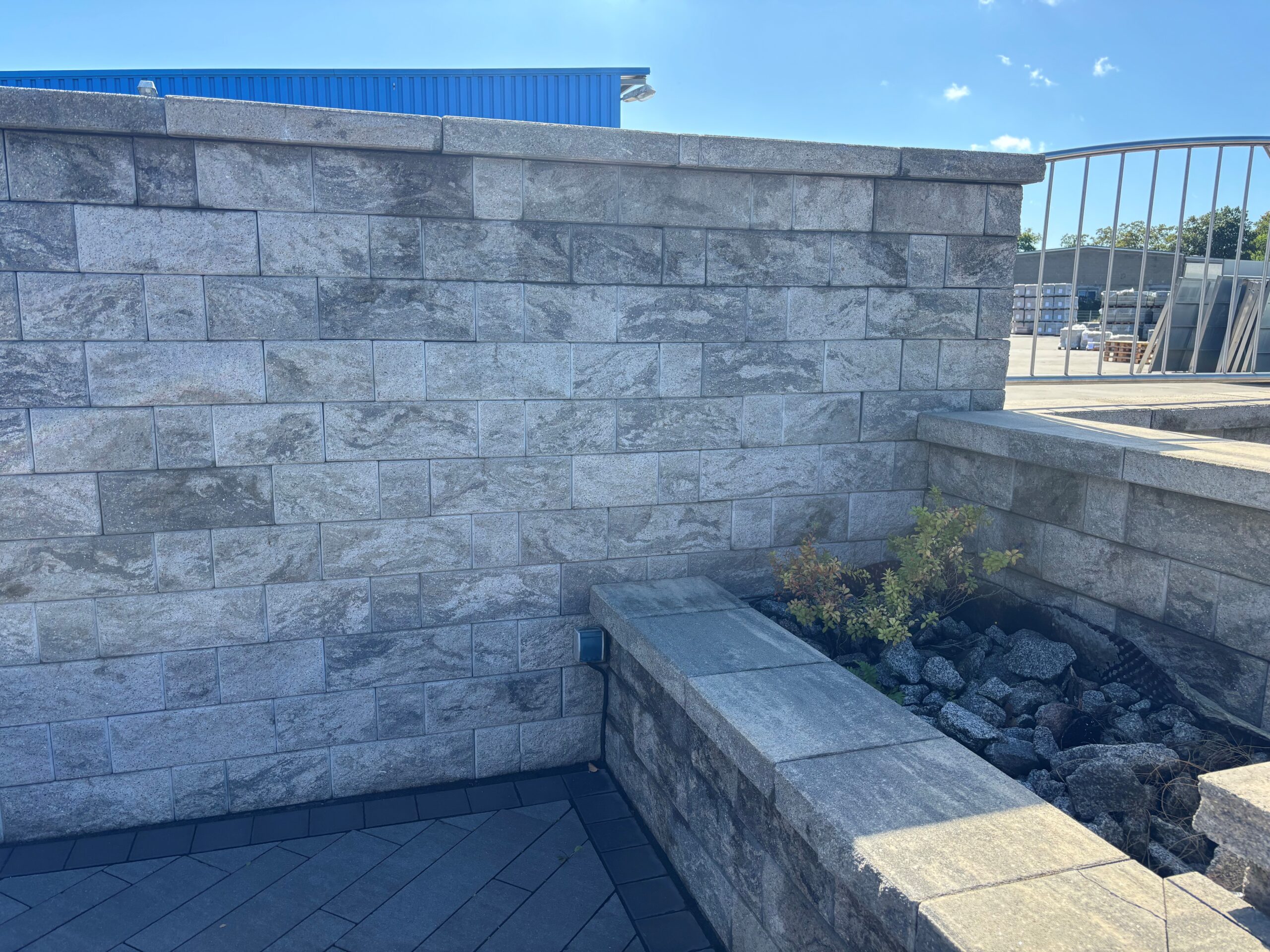 Zudem ermöglicht dieses System die Mauer pro Lage jeweils 6mm oder auch 12mm nach hinten zu versetzen um so eine deutlich höhere Belastbarkeit zu erzielen. Die seitlich an den Steinen angefügten Protektoren gewährleisten einen perfekten Durchblickschutz.